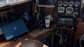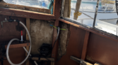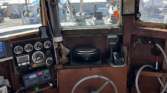 The enclosed pilothouse is atop the 01 deckhouse, and is accessed via a wood hinged door on the port side. Inside, the pilothouse is compact, and contains the vessel controls and electronics. An open vertical ladder access down to the 01 deck level is at the floor level starboard side.