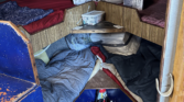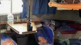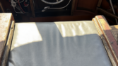 area with raised storage single counter, and on the port side is the original head space, converted to storage, and galley table. The forepeak is open to the cabin and contains four (4) berths. Visibility is via aluminum framed sealed slider windows on port and starboard side. Finishes include wood paneling. Ventilation is via the entrance door and side slider windows.