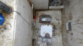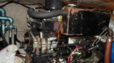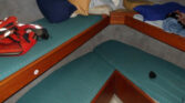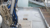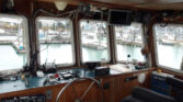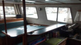 The house is forward the work deck and accessed through an aluminum door in aft, port cabin. Upon entry, down three steps, the galley is positioned starboard aft with refrigerator, Dickinson stove / heater with microwave oven overhead, and an L-shaped Formica-lined counter with recessed sink and storage underneath. Forward galley is settee with Formica-lined fixed table with two facing bench seats. Forward that is countertop and access down to fo’c’sle. To port is day bunk with wood 8-step ladder that provides access to top house. Aft of day bunk is an enclosed head with macerator toilet, shower nozzle, and sink base. The cabin is finished with vinyl headliner, teak paneling and teak trim on walls and cabinetry, vinyl overhead, Formica countertops and linoleum sole.